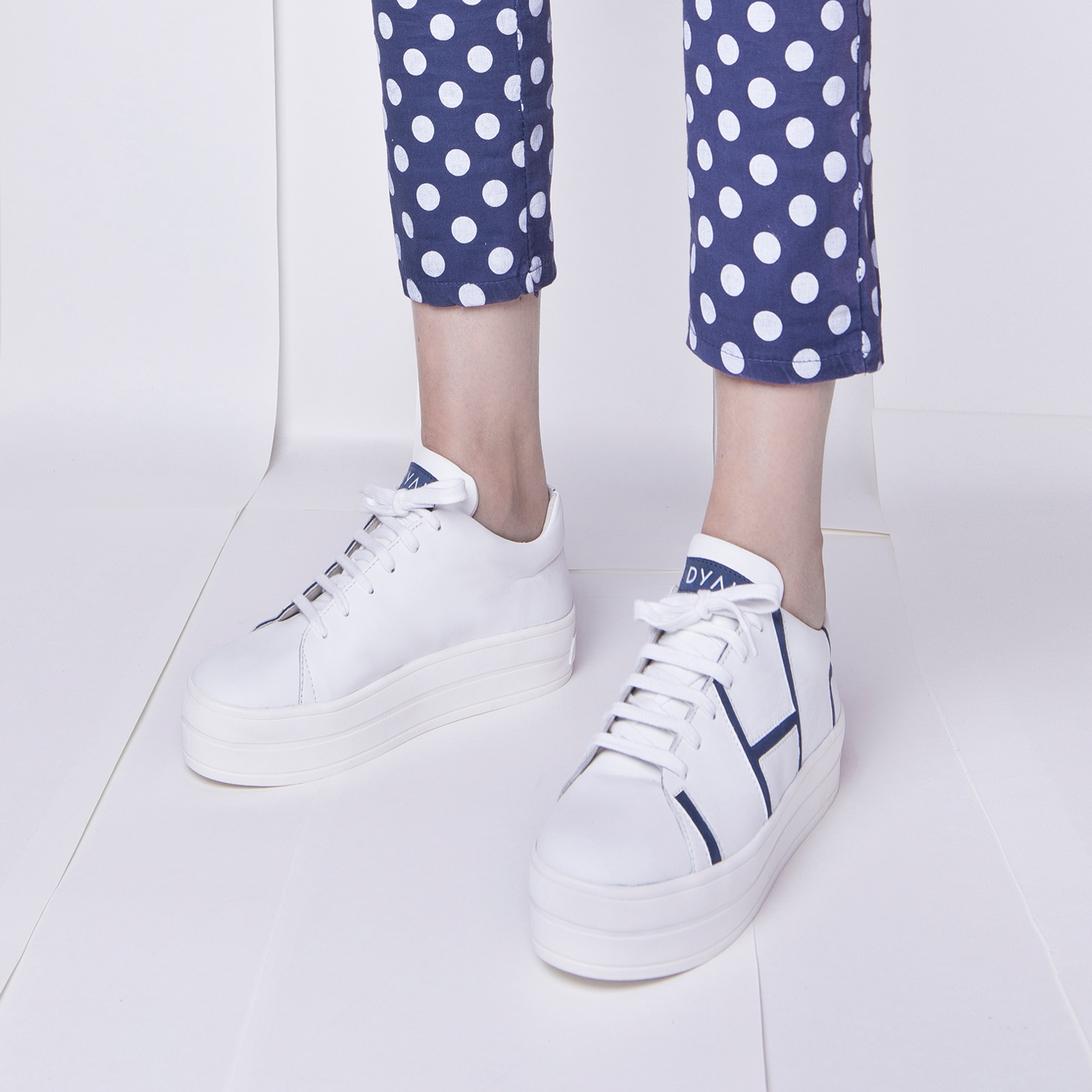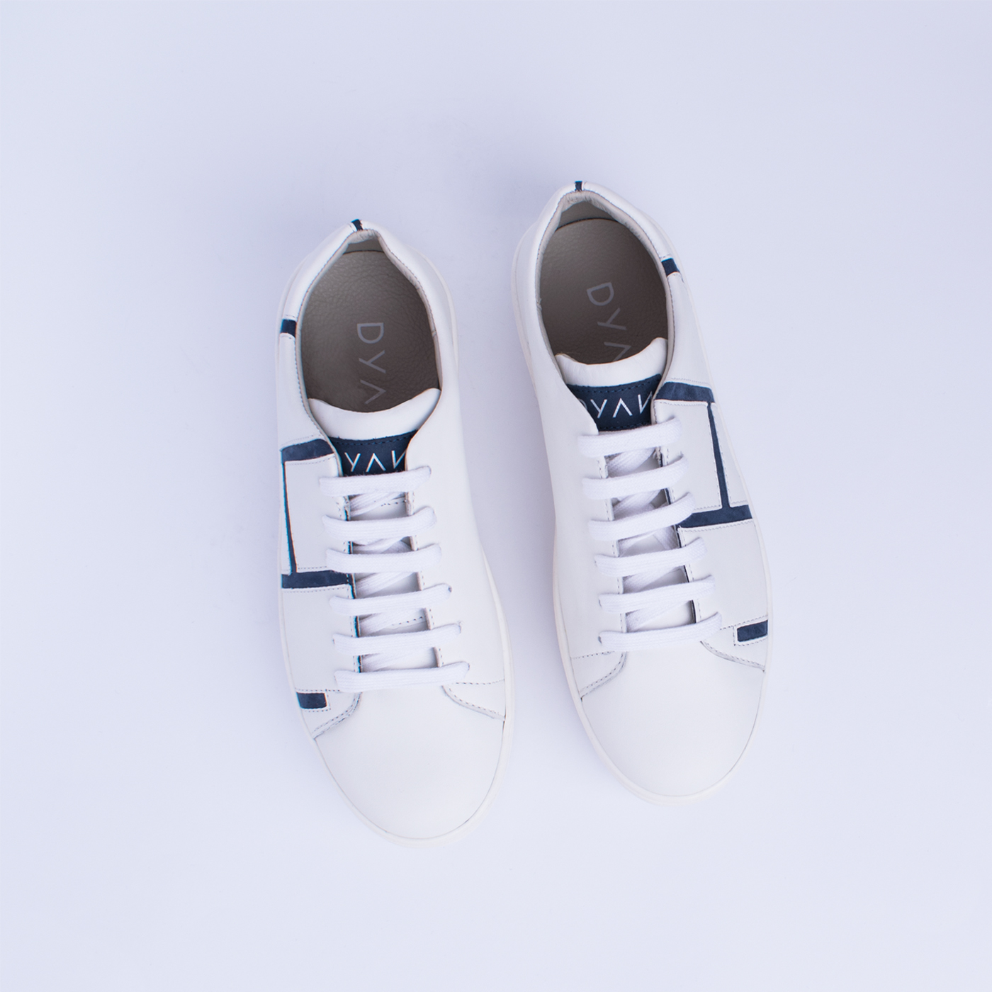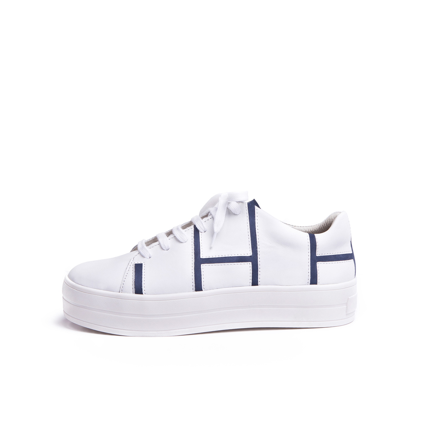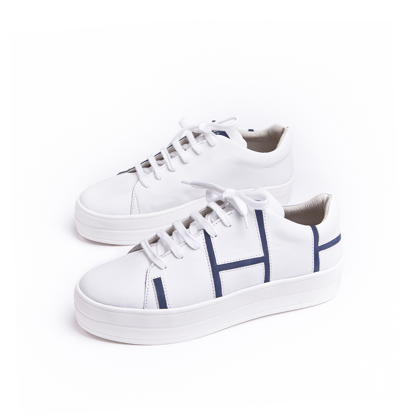The great harmony of contrast and inverse forms. On the white leather the blue lines create a rectangular pattern and make it a more eyecatching piece on one’s feet.