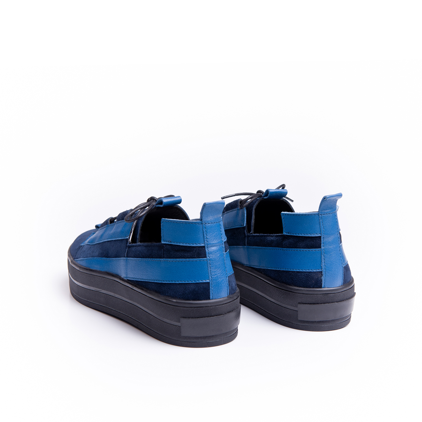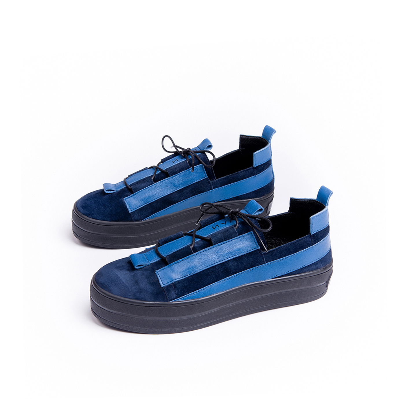 The stripes of JIL evoke the Polish neo avantgard-artist, Edward Krasinski’s signature blue tapes and at the same time make it a very distinctive piece. The thick black sole is paired with a darker nubuk and a lighter toned blue leather.