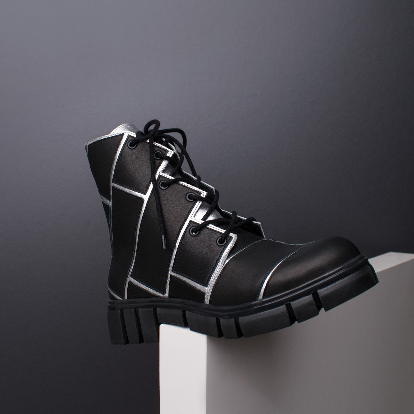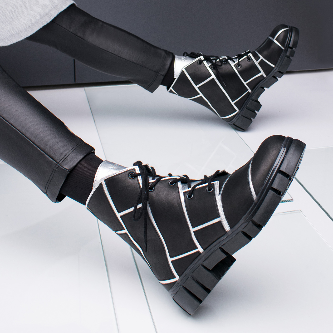 JOYCE is literally a piece of art: every single rectangular is sewed piece by piece on this boot with meticulous work and care. On the shiny silver base the black rectangular shapes show the ways of the labyrinth. The accented sole gives a ‘stand alone’ look to your set.