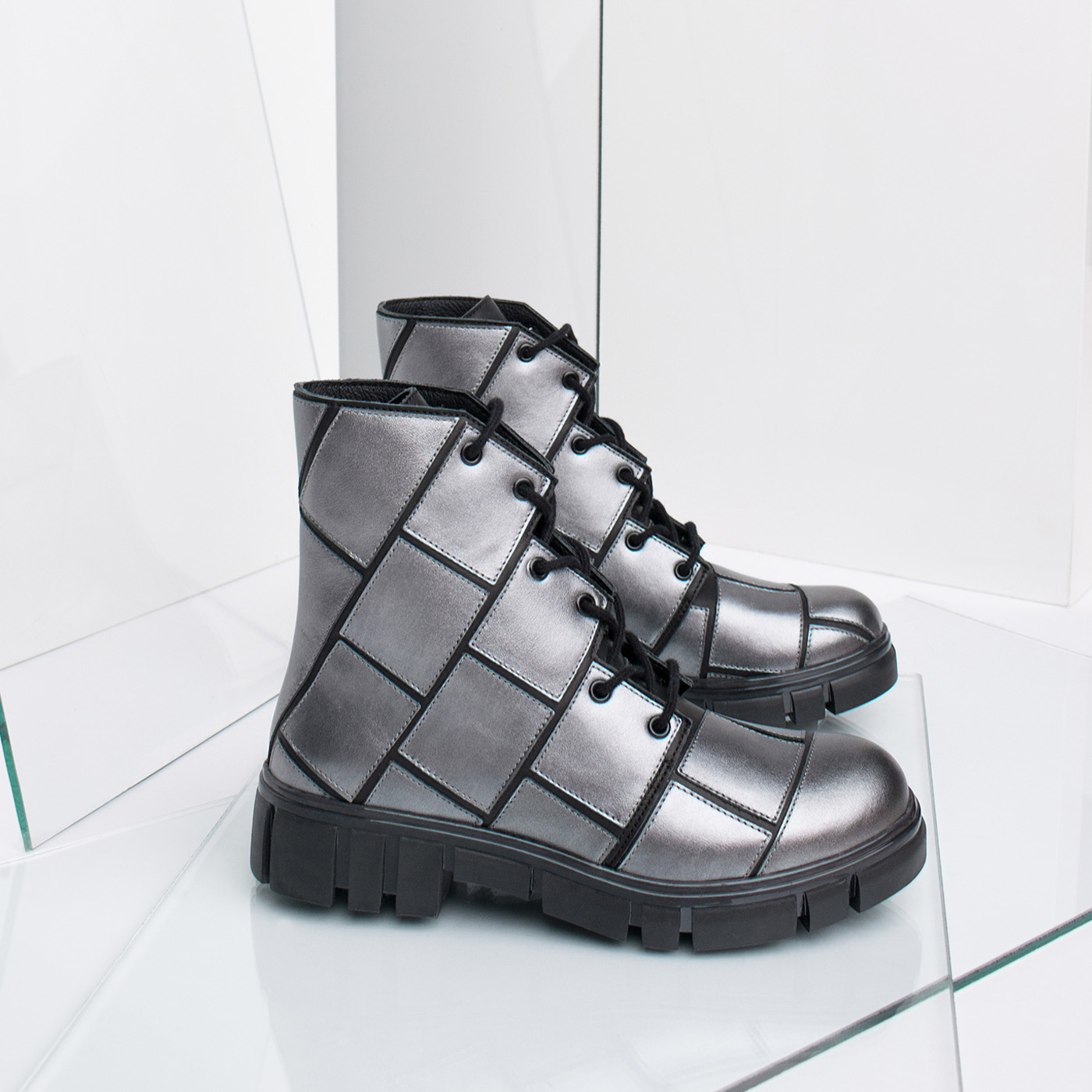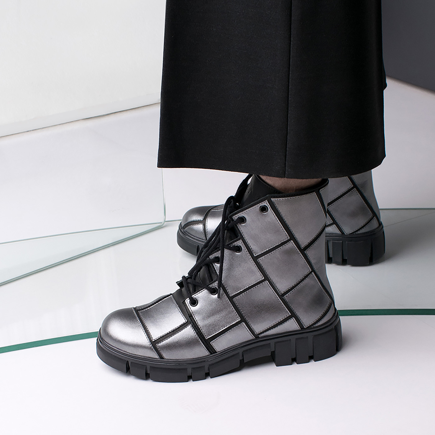 JOYCE is literally a piece of art: every single rectangular is sewed piece by piece on this boot with meticulous work and care. On the black base the graphite grey rectangular shapes show the ways of the labyrinth. The accented sole gives a ‘stand alone’ look to your set.