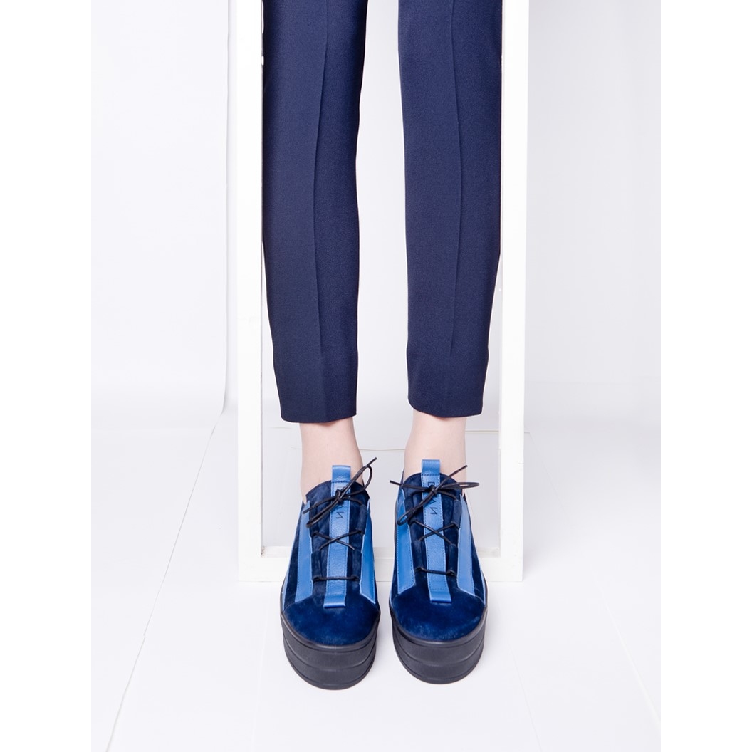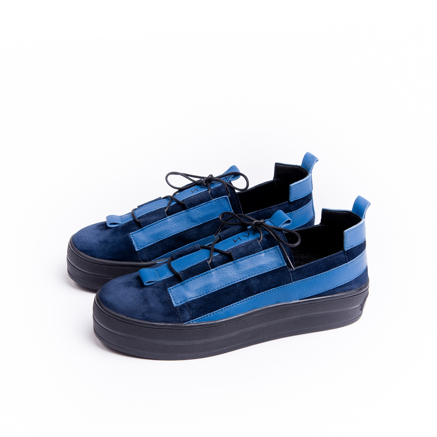 The stripes of JIL evoke the Polish neo avantgard-artist, Edward Krasinski’s signature blue tapes and at the same time make it a very distinctive piece. The thick black sole is paired with a darker nubuk and a lighter toned blue leather.
