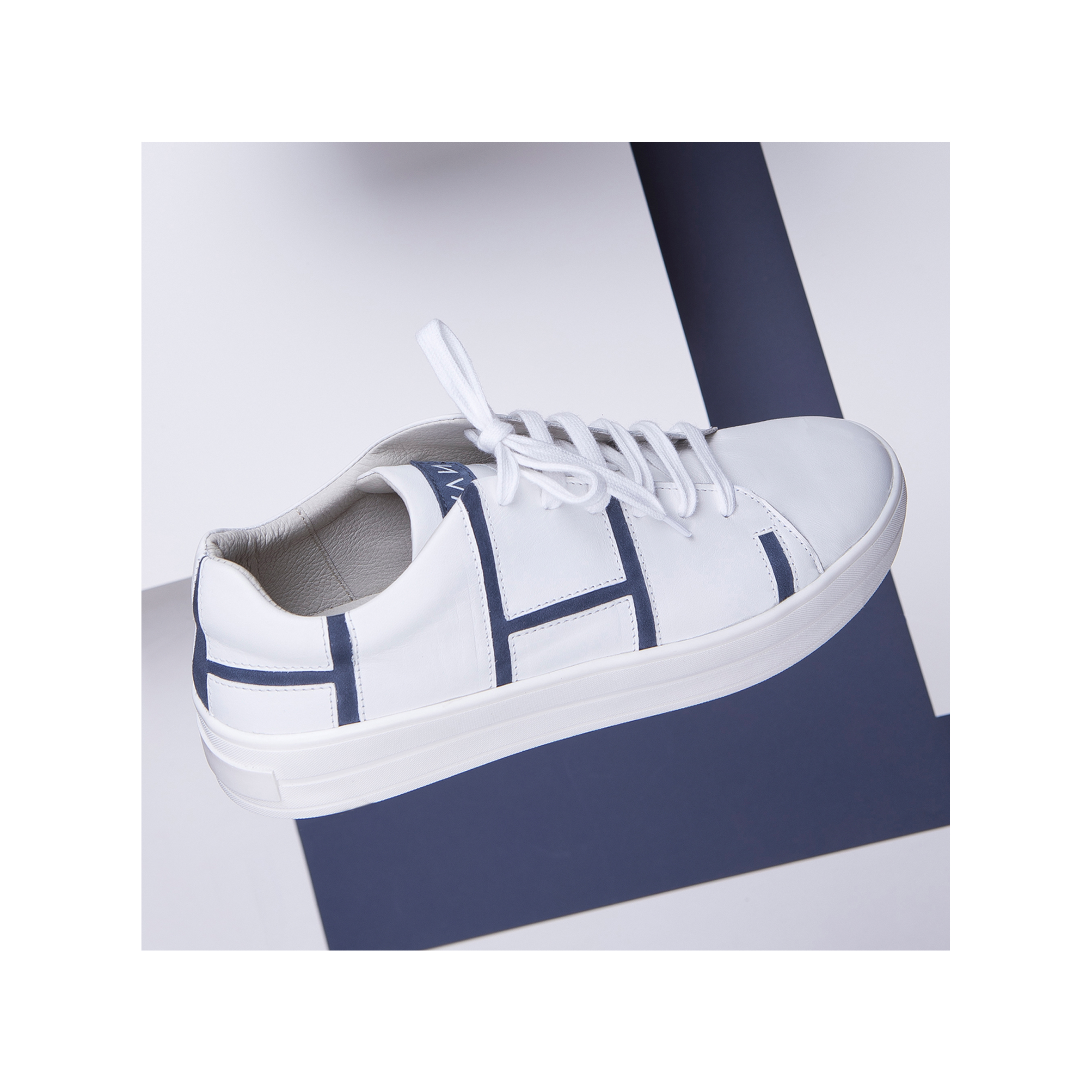 A kontraszt és az inverz formák harmóniája. A fehér bőrön megjelenő kék vonalak téglalapos mintázatot hoznak létre, amely gondoskodik róla, hogy a cipő viselőjének lábára szegeződjön a tekintetet.