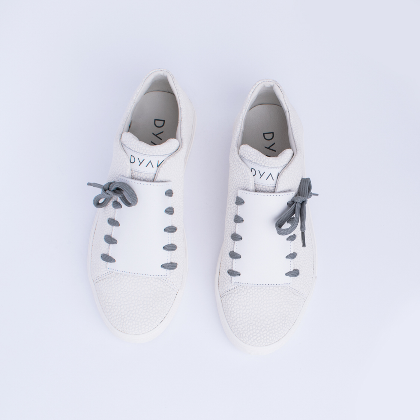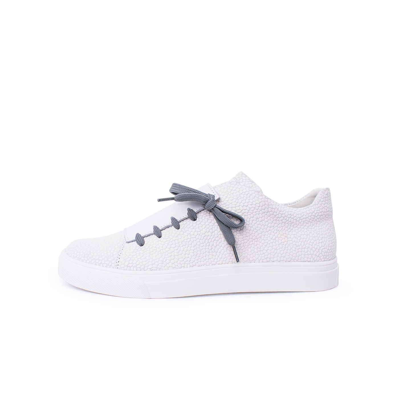 Felejtsd el az unalmas tornacipőket! A texturált fehér bőr, az egyoldalas befűzési megoldás és a szürke cipőfűző egy teljesen új megközelítése a közkedvelt fehér tornacipőnek. Ez a pár elengedhetetlen kiegészítője lesz minden minimalista gardróbnak ebben a szezonban!